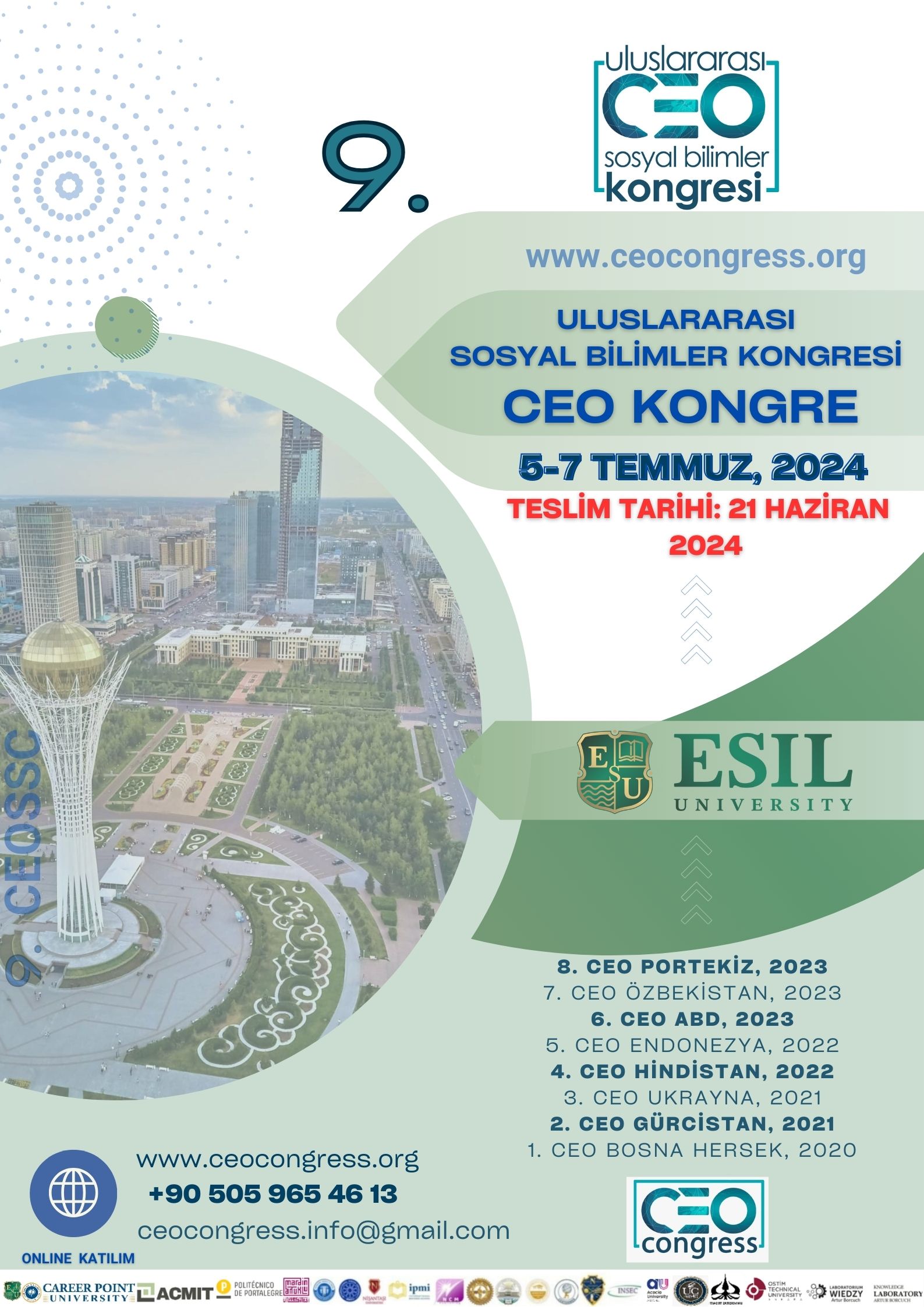 9. Uluslararası CEO (İletişim, Ekonomi, Organizasyon) Sosyal Bilimler Kongresi, 5-7 Temmuz 2024 tarihlerinde Kazakistan'da Esil Üniversitesi ev sahipliğinde Career Point University, Polytechnic Institute of Portalegre, Acacia University, IPMI International Business School, Mohanlal Sukhadia University, Samarkand Branch of Tashkent University of Economics, International Vision University, Alfred Nobel University, Nişantaşı Üniversitesi, University of Prizren, Cyprus West University, Ciputra University, Knowledge Laboratory, ACMIT, Insec, NCM Publishing, CEO Tekmer, Universitas Bhayangkara, Ostim Teknik Üniversitesi ve Mardin Artuklu Üniversitesi iş birliği ile düzenlenecektir.